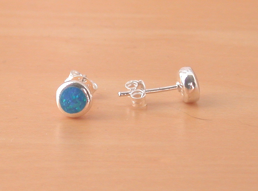 Sterling silver round pendant set with blue opal (lab created) gemstone. The pendant measures 11mm height x 11mm width. The bale measures 6mm x 3mm. This pendant will come complete with an 18 inch sterling silver curb chain. These earrings measure 6mm x 6mm. Stamped 925. Opal is the birthstone for October.