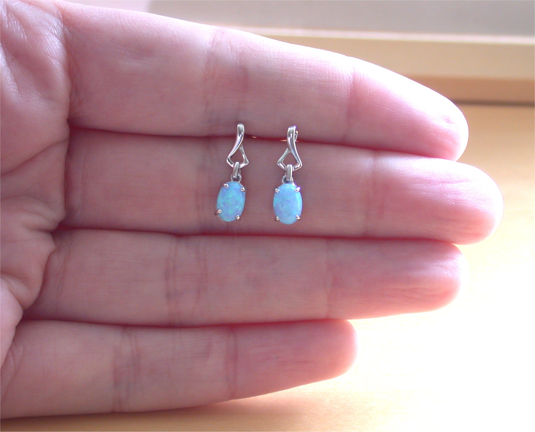 Sterling silver blue opal (lab created) gemstone necklace. The necklace measures 18 inch in length. The centre piece measures 30mm width x 5mm height. The gemstones measure 5mm, 3mm, 2mm. The blue opal stud earrings measure 16mm x 5mm. Opal is the birthstone for October.