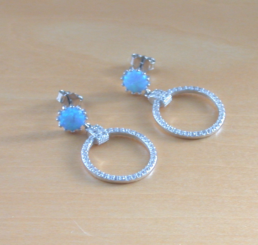 Sterling silver hoop pendant set with blue opal (lab created) gemstones and Cz gemstones. The pendant measures 28mm height x 20mm width. The opal gemstone measures 5mm. The blue opal and cz earrings measure 27mm height x 17mm width. Blue opal gemstones measure 5mm. 925. Opal is the birthstone for October.