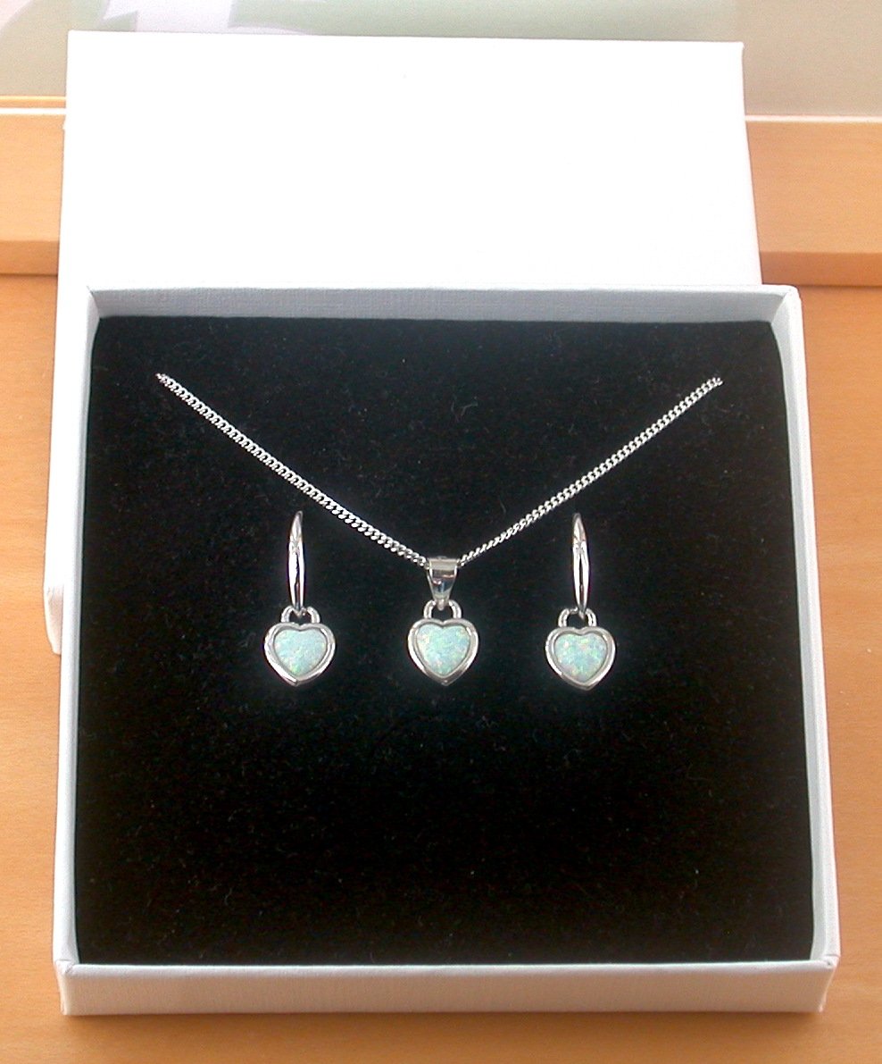 Sterling silver white opal heart pendant, chain and earrings set. The heart pendant measures 15mm height x 7mm width (including bale). The white opal stud earrings measure 20mm height x 7mm width(including hooks). Opal is the birthstone for October.
