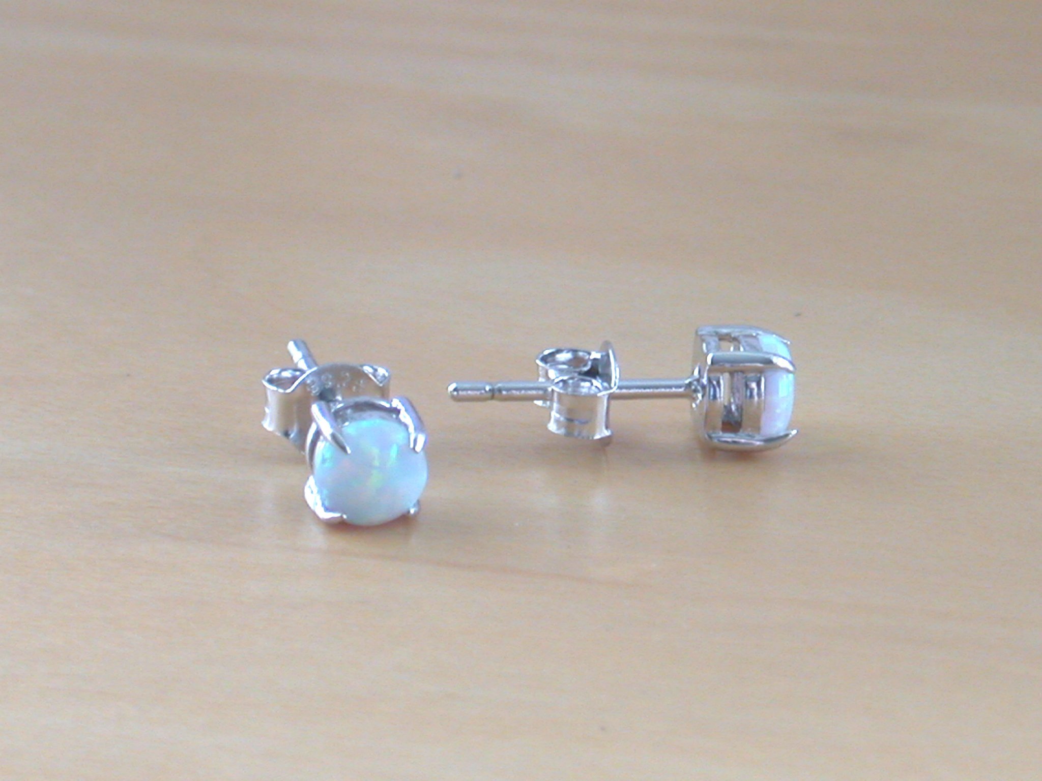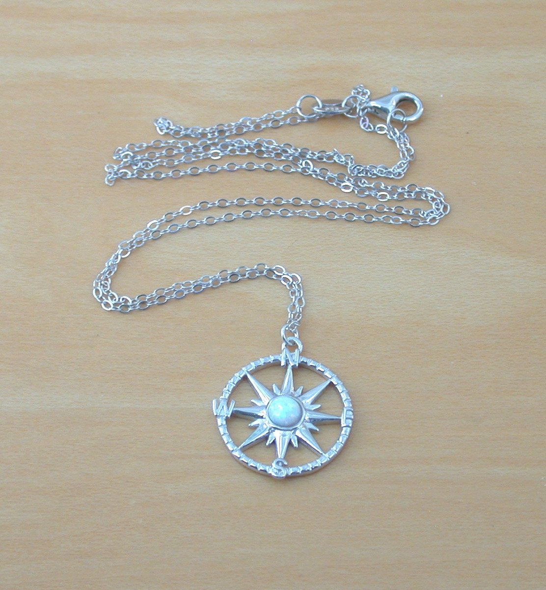 Sterling silver white opal (lab created) gemstone compass necklace and earrings. The necklace measures 18 inches in length. The compass measures 17mmm x 17mm. The centre white opal gemstone measures 3mm. The white opal stud earrings measure 4mm. Stamped 925. Opal is the birthstone for October.