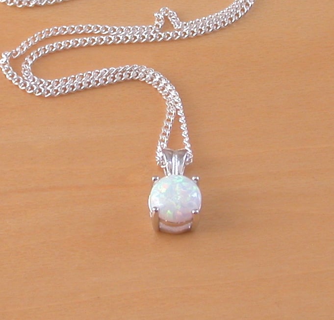 Sterling silver white opal (lab created) pendant. This pendant measures 11mm height x 6mm width. The solitaire gemstone measures 6mm height x 6mm width.This pendant will come complete with an 18 inch sterling silver curb chain. The white opal stud earrings measure 5mm x 5mm. Stamped 925. Opal is the birthstone for October.