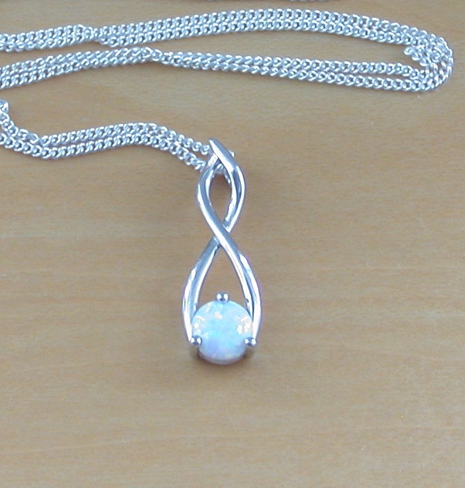 Sterling silver twist pendant set with white opal (lab created) gemstone. The pendant measures 25mm height x 8mm width. The opal gemstone measures 7mm. This pendant will come complete with an 18 inch sterling silver curb chain. The white opal stud earrings measure 5mm x 5mm. Stamped 925. Opal is the birthstone for October.