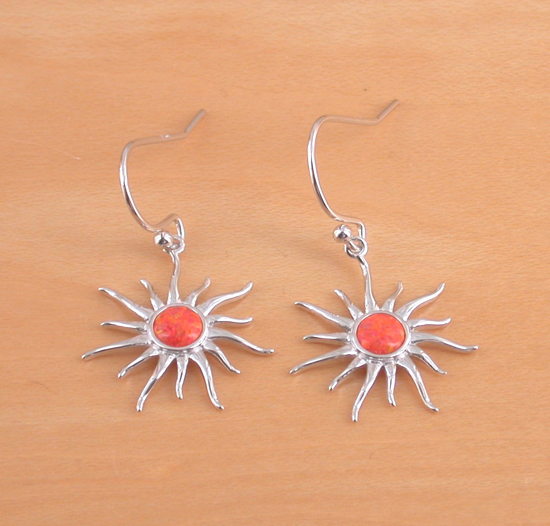Sterling silver, fire opal gemstone (lab created) sun pendant. The pendant measures 35mm height x 35mm width. The opal gemstone measures 9mm. The pendant will come complete with an 18 inch sterling silver curb chain. These opal sun earrings measure 20mm height x 20mm width. The white opal gemstone measures 5mm. Stamped 925. Opal is the birthstone for October.