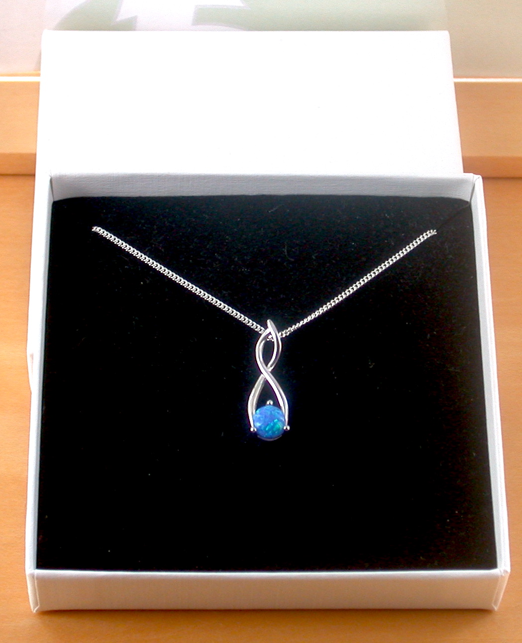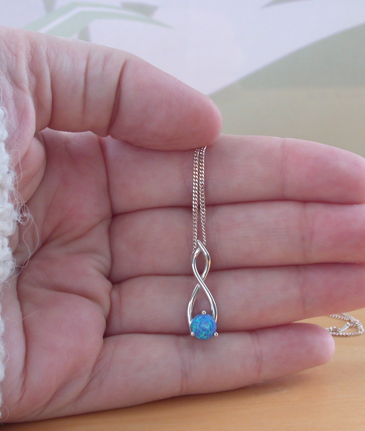 Sterling silver twist pendant set with blue opal (lab created) gemstone. The pendant measures 25mm height x 8mm width. The opal gemstone measures 7mm. This pendant will come complete with an 18 inch sterling silver curb chain (16 inch, 20 inch and 22inch chains are now available, please leave a note through checkout) Stamped 925. Opal is the birthstone for October.