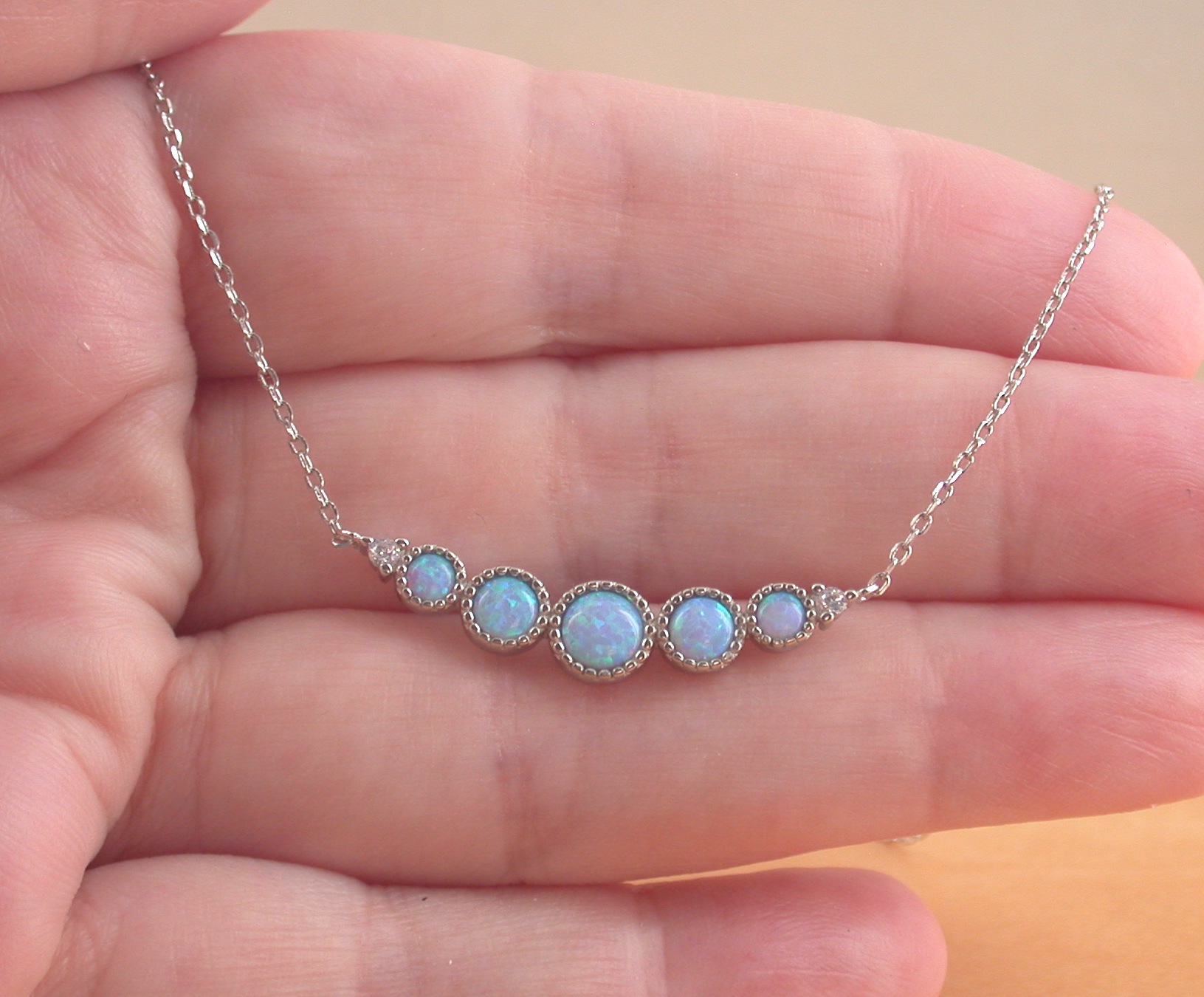 Sterling silver blue opal (lab created) gemstone necklace. The necklace measures 18 inch in length. The centre piece measures 30mm width x 5mm height. The gemstones measure 5mm, 3mm, 2mm. Opal is the birthstone for October.