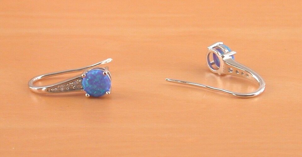 Sterling silver, blue opal (lab created)gemstone with Cz, hook earrings. These earrings measure 13mm height x 6mm width. Blue opal gemstones measure 5mm. Stamped 925. Opal is the birthstone for October.