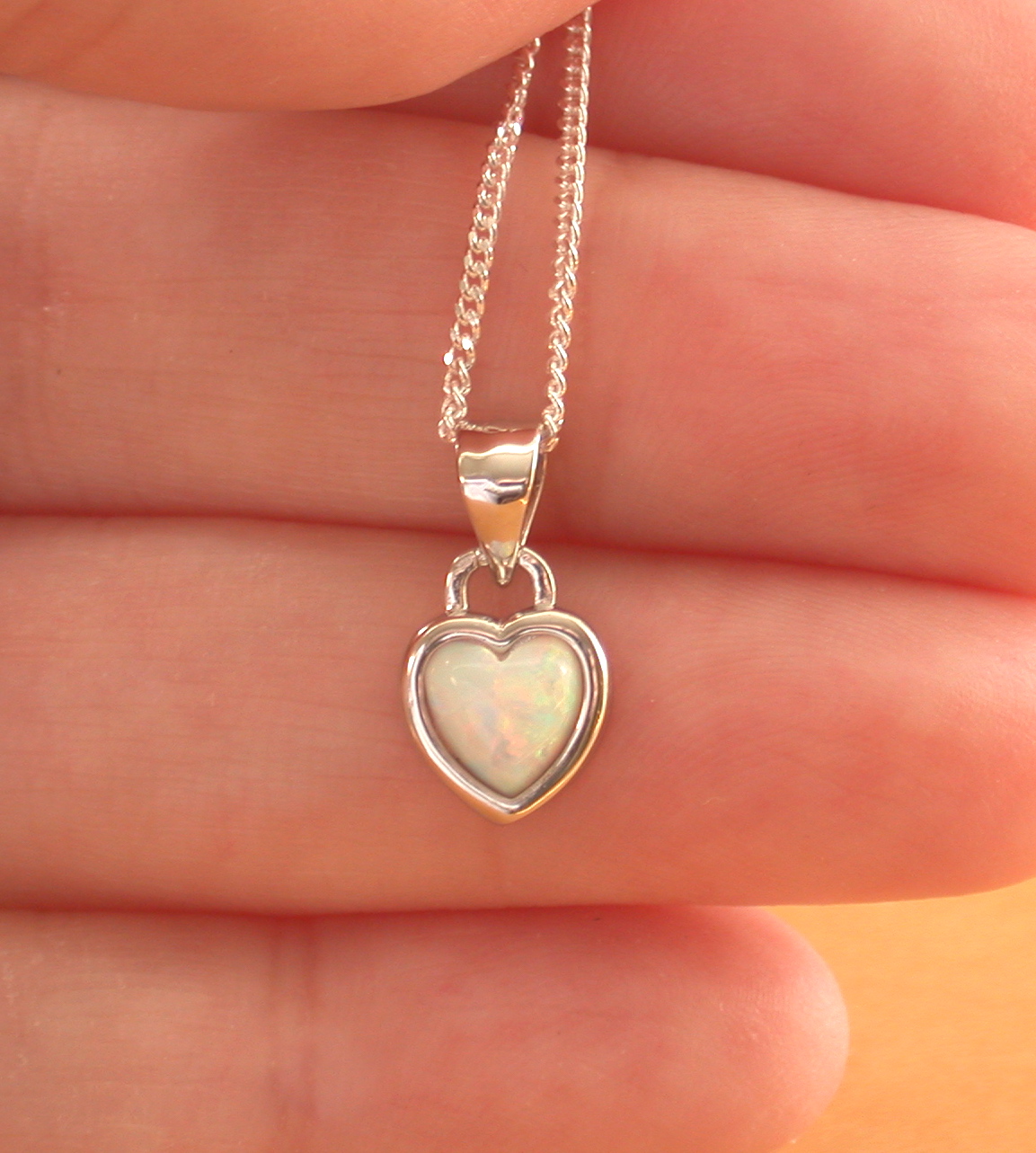 Sterling silver white opal (lab created) heart gemstone pendant. The pendant measures 15mm height x 7mm width. The heart gemstone measures 7mm height x 7mm width. The pendant will come complete with an 18 inch sterling silver curb chain (16, 20 and 22 inch chains now available, please leave message through checkout). Stamped 925. Opal is the birthstone for October.