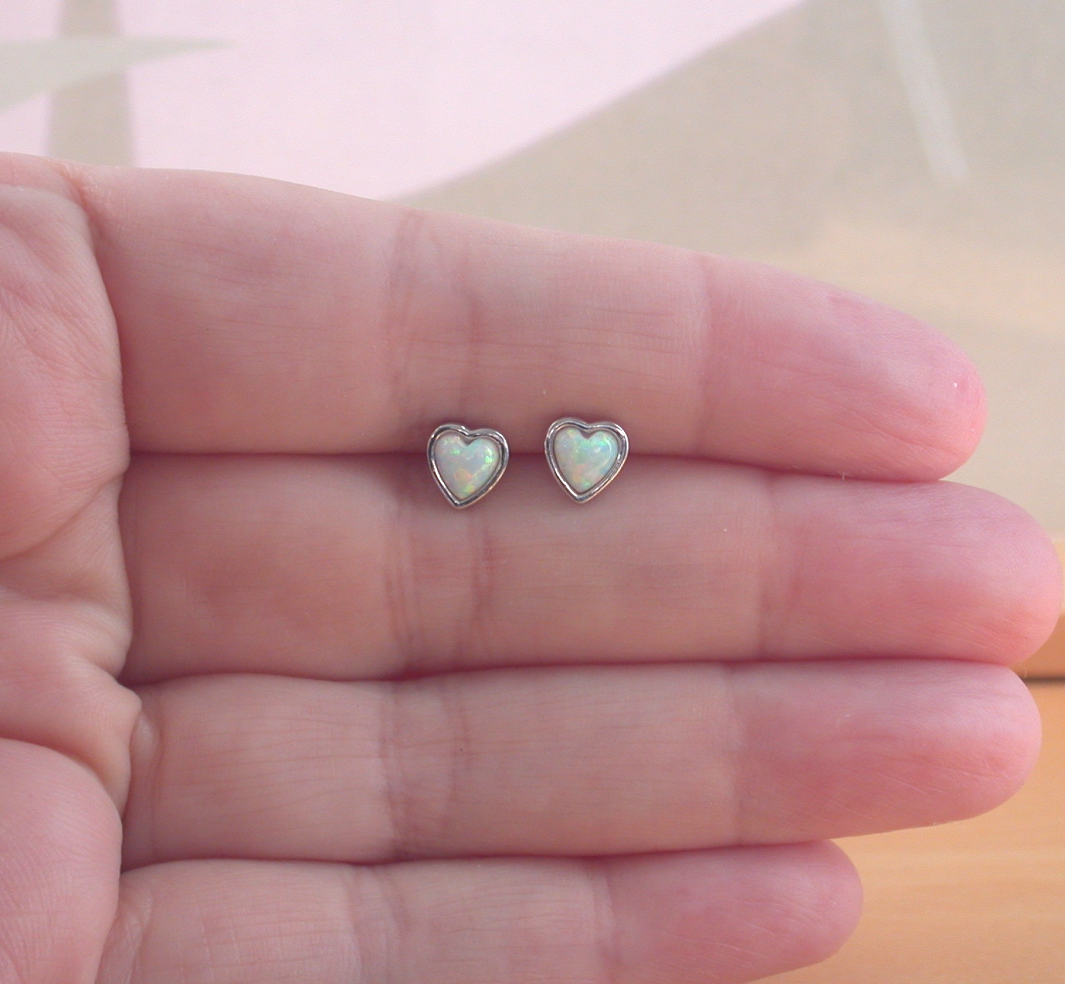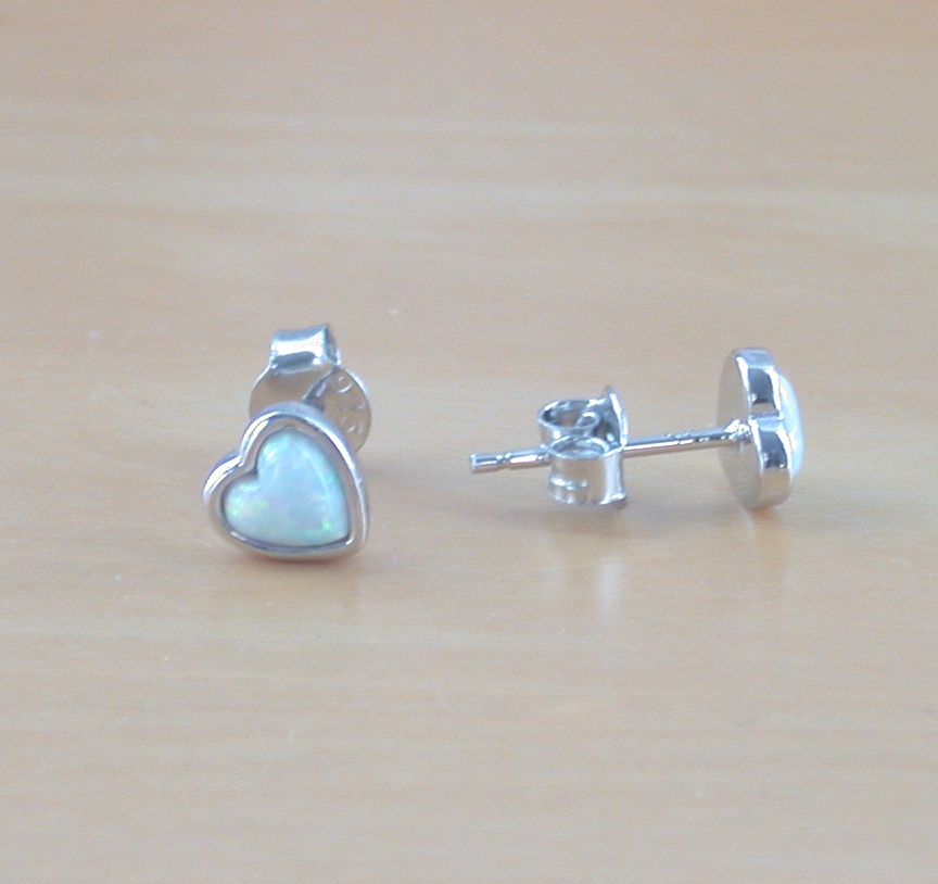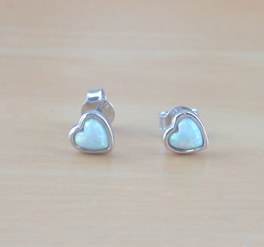 Sterling silver heart stud earrings with white opal (lab created) gemstones. These earrings measure 5mm height x 5mm width. Stamped 925.