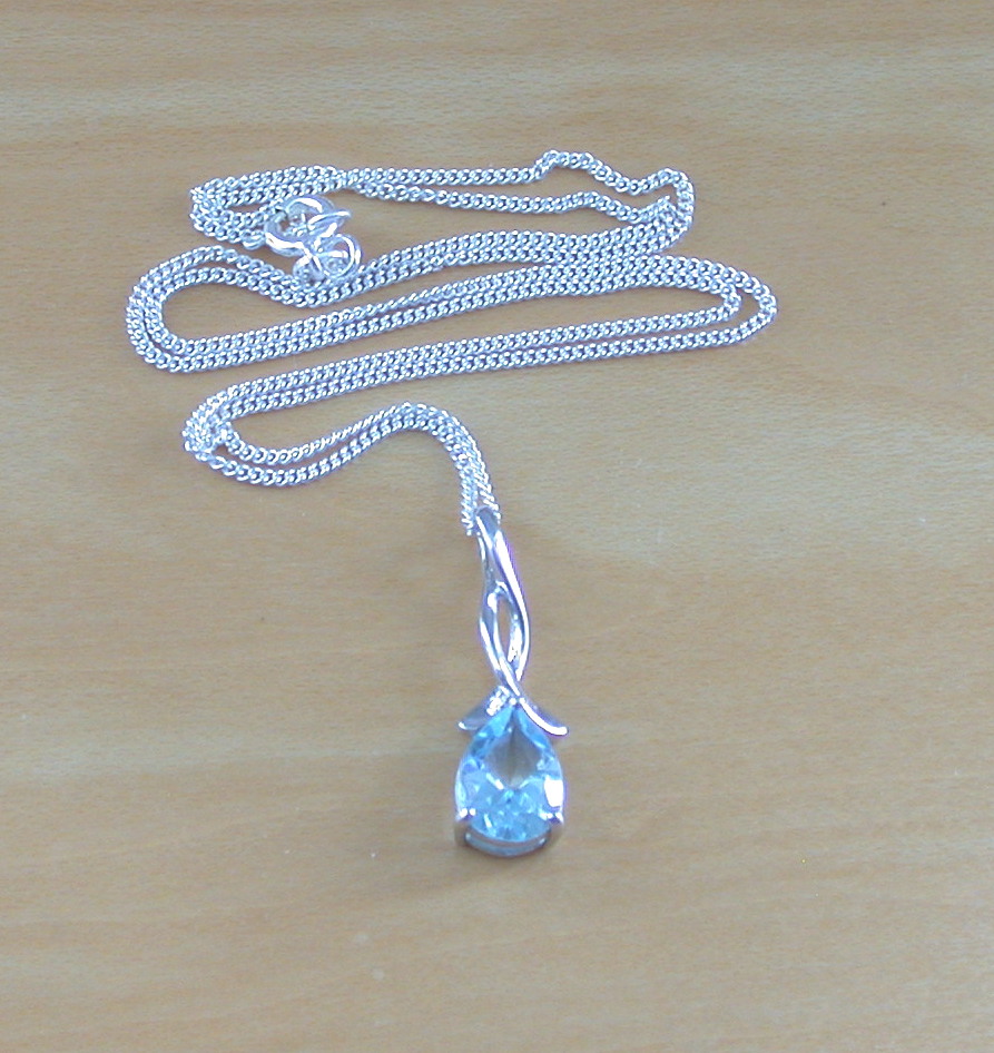 Sterling silver blue topaz pendant. This pendant measures 25mm height x 9mm width (including the bale).The centre blue topaz gemstone measures 10mm height x 7mm width. This pendant will come complete with an 18 inch sterling silver curb chain (16, 20 and 22 inch chains now available, please leave message through checkout) The blue topaz earrings measure 7mm length x 5mm width. Stamped 925. Topaz is the birthstone for November.