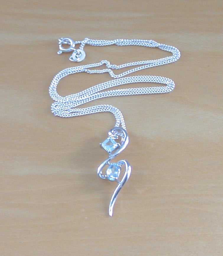 Sterling silver, s design pendant set with genuine blue topaz gemstone. The pendant measures 30mm height x 13mm width. The blue topaz oval gemstone measures 6mm x 4mm. The square topaz measures 4mm x 4mm. This pendant will come complete with 18 inch sterling silver curb chain (16, 20 and 22 inch chains now available, please leave message through checkout). The blue topaz earrings measure 8mm length x 5mm width. Stamped 925. Topaz is the birthstone for November.