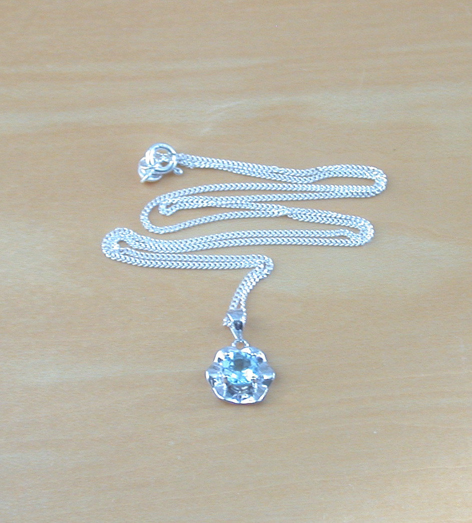 Simple but pretty design, blue topaz gemstone pendant and chain. The pendant measures 17mm length x 11mm width (including the bale).The centre blue topaz gemstone measures 5mm. This pendant will come complete with an 18 inch sterling silver curb chain (16, 20 and 22 inch chains now available, please leave message through checkout).The blue topaz flower earrings measure 9mm x 9mm. Stamped 925. Topaz is the birthstone for November.