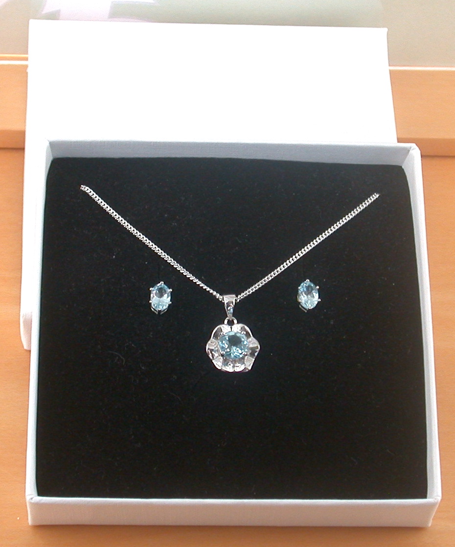 This pendant, chain and earrings will be presented in a white gift box and an organza gift bag. This will include an blue topaz gemstone description card below: