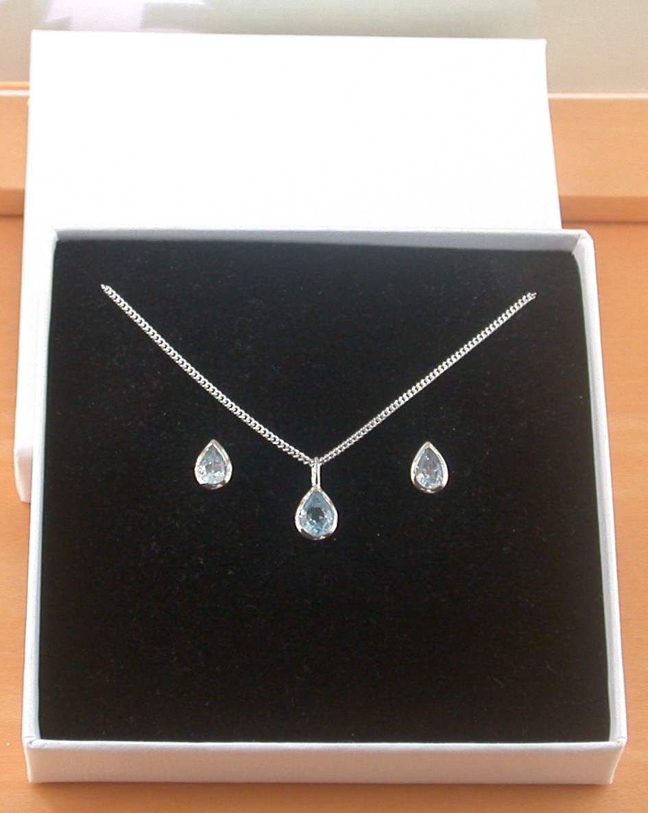 This pendant, chain and earrings will be presented in a white gift box and an organza gift bag. This will include an blue topaz gemstone description card below: