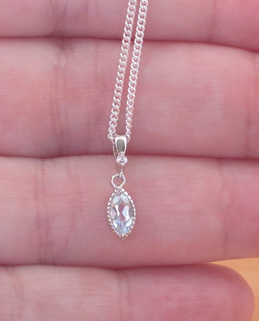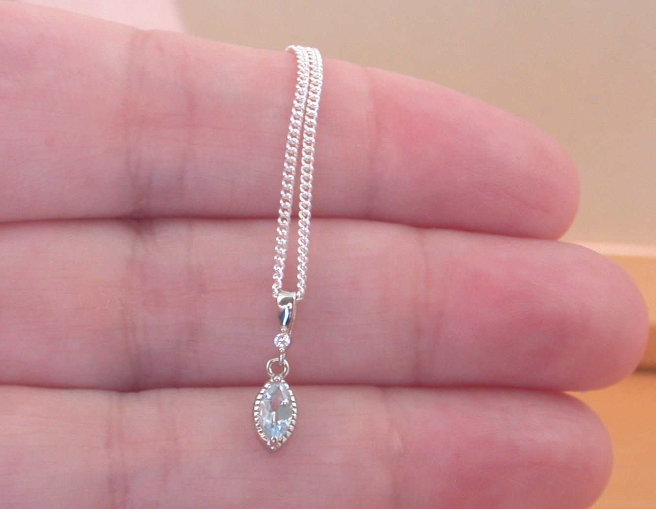 Sterling silver marquise pendant with genuine blue topaz gemstone. This small pendant measures 7m in length x 4mm in width (excluding bale). Stamped 925. Topaz is the birthstone for November.