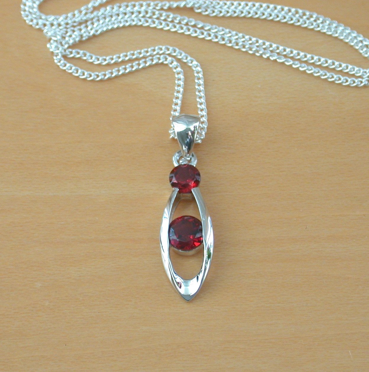 Sterling silver, oval design pendant set with genuine garnet gemstones. This pendant measures 20mm length x 7mm width. The bale measures 5mm x 2mm. The garnet gemstones a 4mm and 3mm. This pendant will come complete with 18 inch sterling silver curb chain (16, 20 and 22 inch chain now available, please leave message through checkout). The sterling silver garnet stud earrings measure 5mm x 5mm. Stamped 925. Garnet is the birthstone for January.