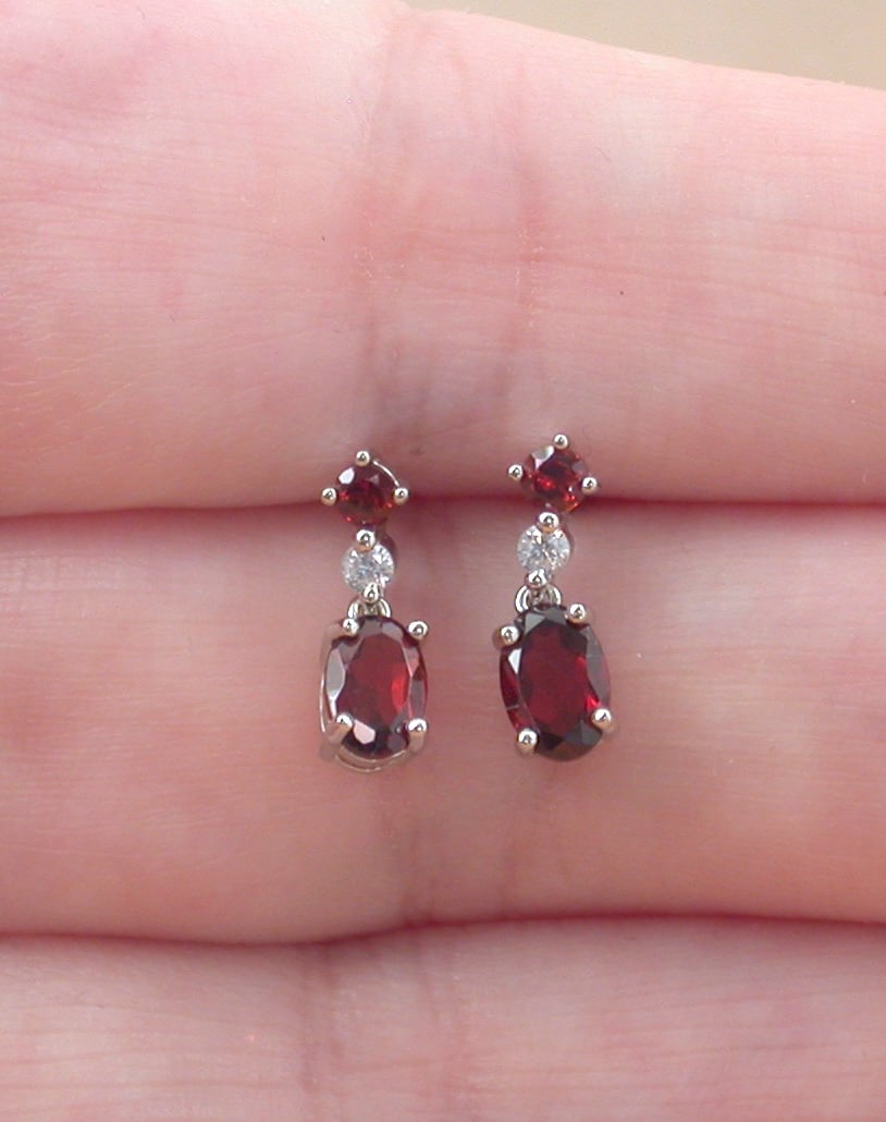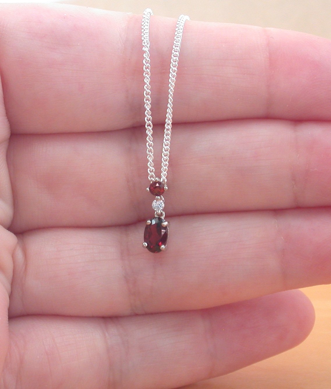 Sterling silver pendant set with genuine garnet gemstone and Cz crystals. This pendant measures 12mm height x 4mm width.This pendant will come complete with an 18 inch sterling silver curb chain (16, 20 and 22 inch chains now available, please leave message through checkout) The garnet and Cz gemstone earrings measure 13mm height x 6mm width. Stamped 925. Garnet is the birthstone for January.