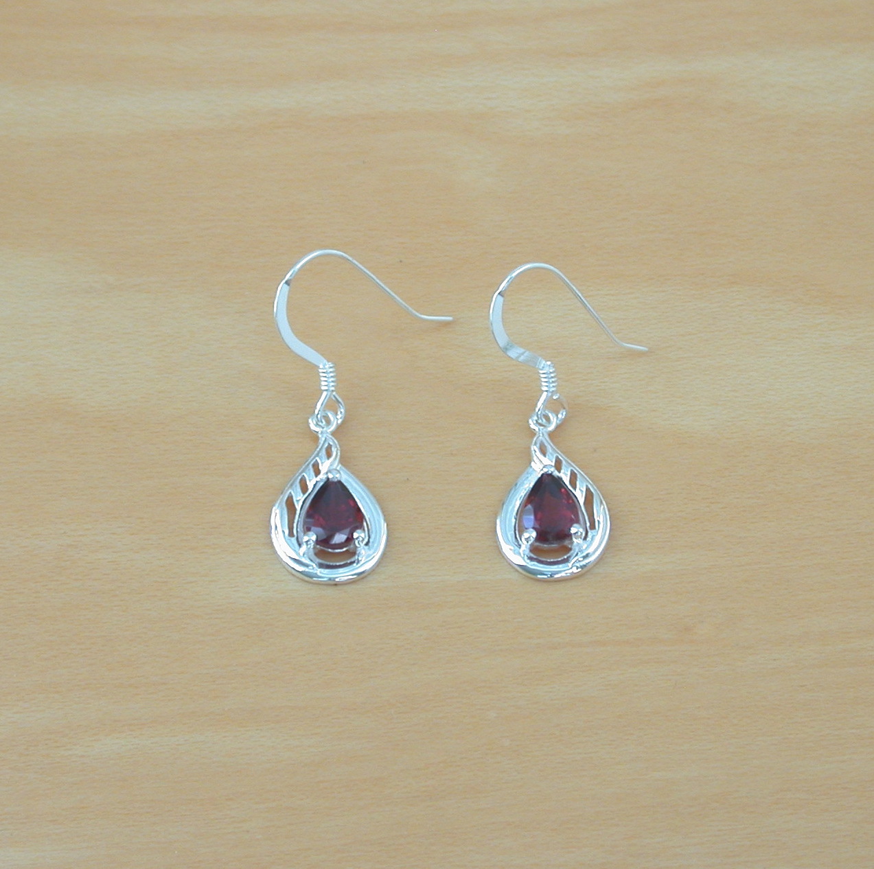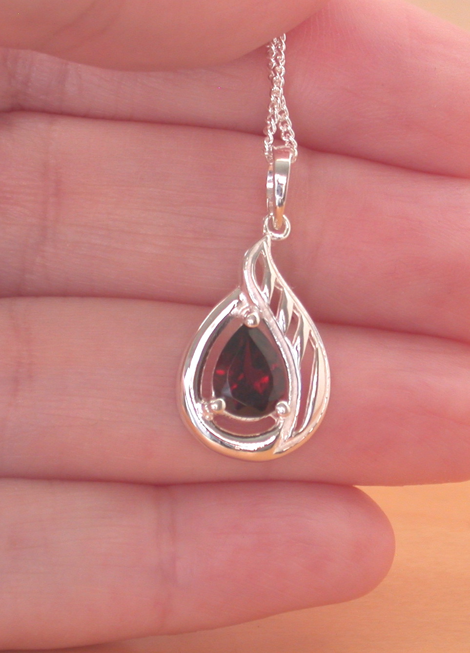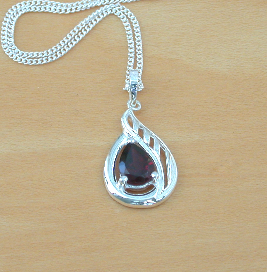 Sterling silver, teardrop design pendant set with genuine garnet gemstone. This pendant measures 20mm length x 13mm width (including bale). The garnet gemstone measures 7mm x 6mm.. This pendant will come complete with an 18 inch sterling silver curb chain (16, 20 and 22 inch chains now available, please leave message through checkout). The earrings measure 15mm length x 10mm width. The garnet gemstone measures 5mm x 3mm. Stamped 925. Garnet is the birthstone for January.