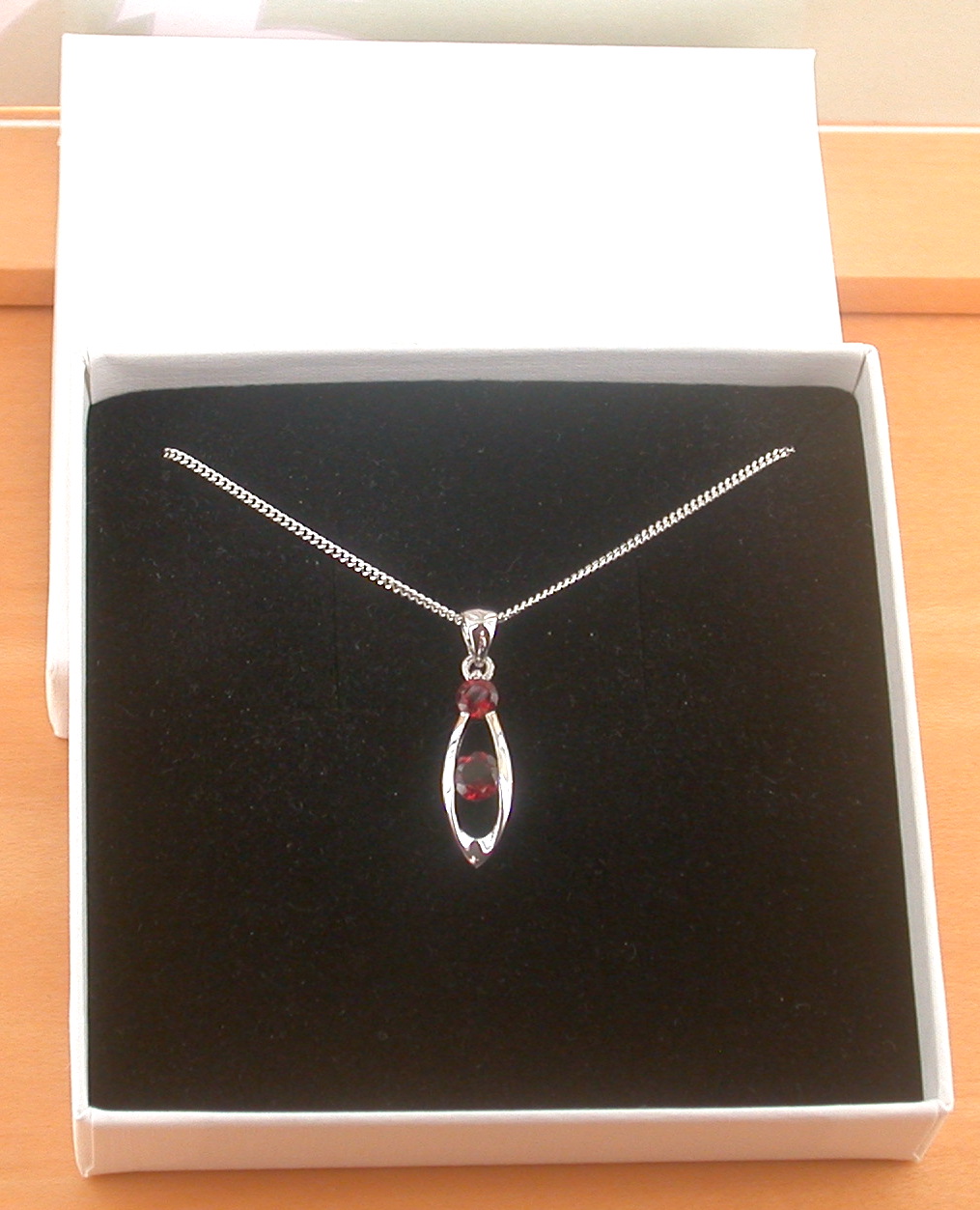 This pendant and chain will be presented in a white gift box and pretty organza gift bag. Includes garnet gemstone desription gift card below.