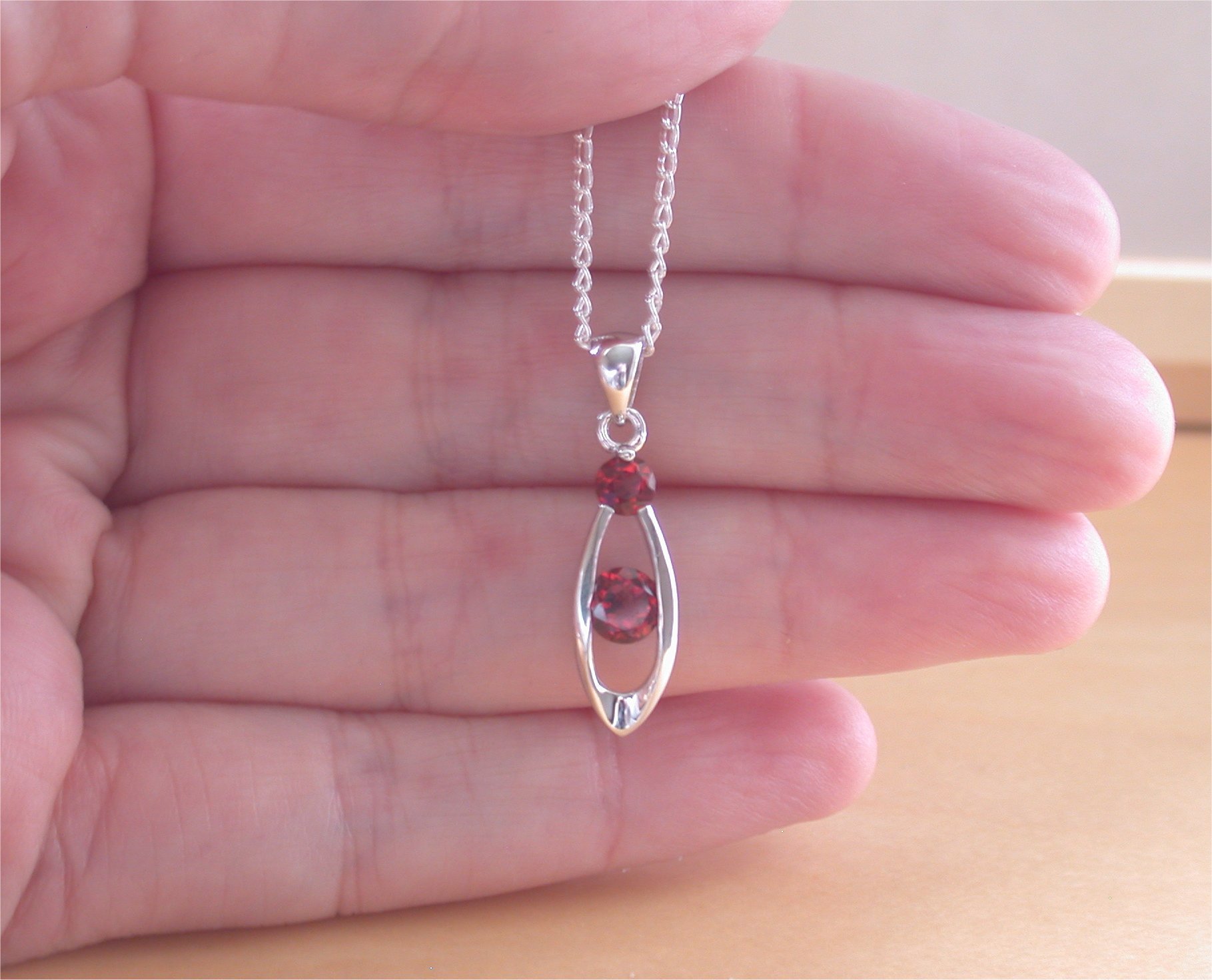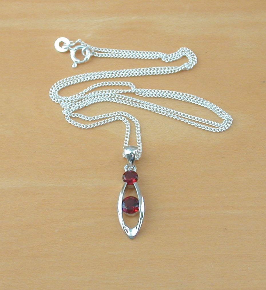 Sterling silver, oval design pendant set with genuine garnet gemstones. This pendant measures 20mm length x 7mm width. The bale measures 5mm x 2mm. The garnet gemstones a 4mm and 3mm. This pendant will come complete with 18 inch sterling silver curb chain (16, 20 and 22 inch chain now available, please leave message through checkout). Stamped 925. Garnet is the birthstone for January.