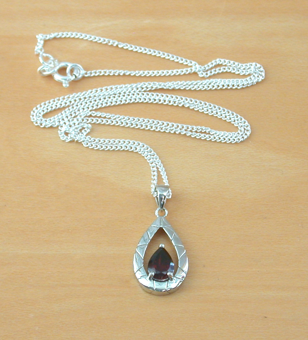 Sterling silver, teardrop design pendant set with genuine garnet gemstone. This pendant measures 22mm length x 11mm width (including bale). The garnet gemstone measures 7mm x 5mm.. This pendant will come complete with an 18 inch sterling silver curb chain (16, 20 and 22 inch chains now available, please leave message through checkout) Stamped 925. Garnet is the birthstone for January.
