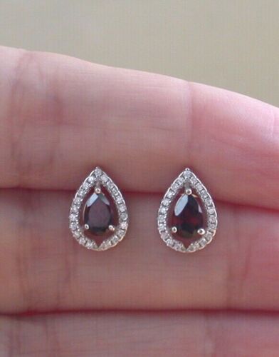 Sterling silver, garnet and Cz stud earrings. Each earring measure 12mm height x 8mm width. The garnet gemstones measure 6mm x 4mm. Stamped 925. Garnet is the birthstone for January.