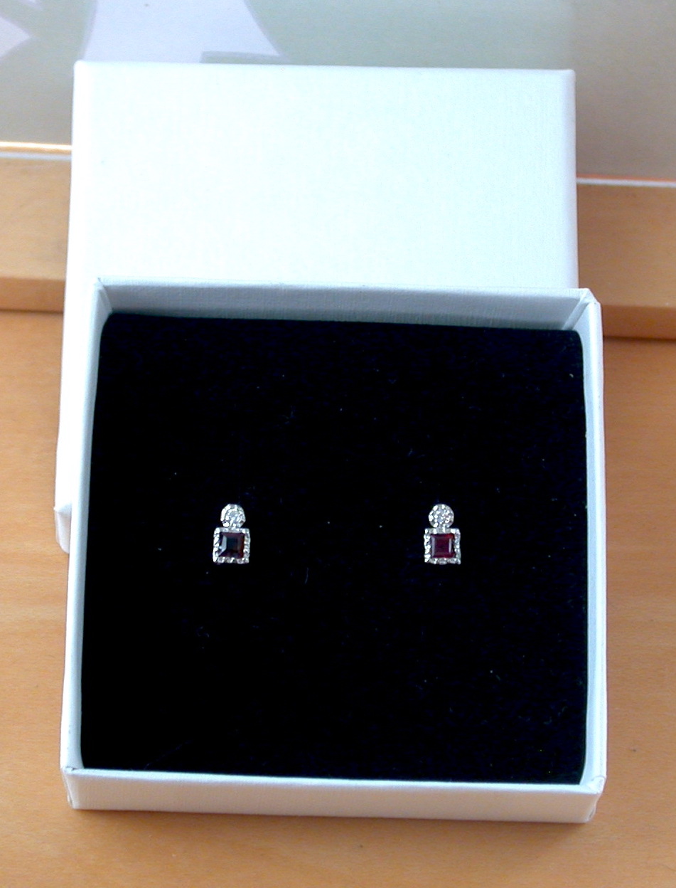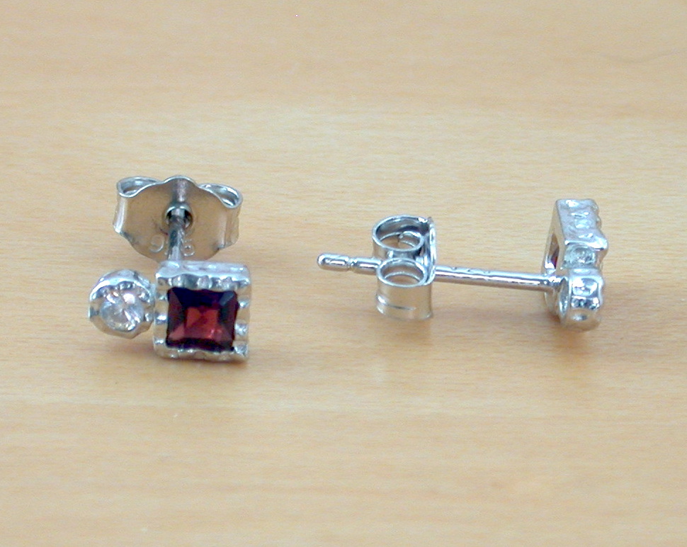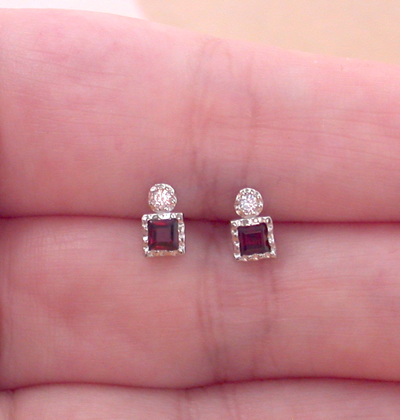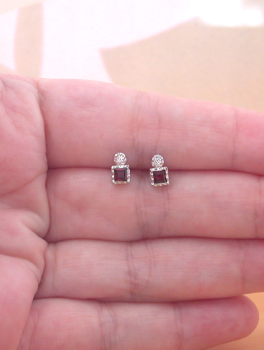 Sterling silver, garnet and Cz square stud earrings. Each earring measure 7mm height x 4mm width. The garnet gemstones measure 2mm x 2mm. Stamped 925. Garnet is the birthstone for January.