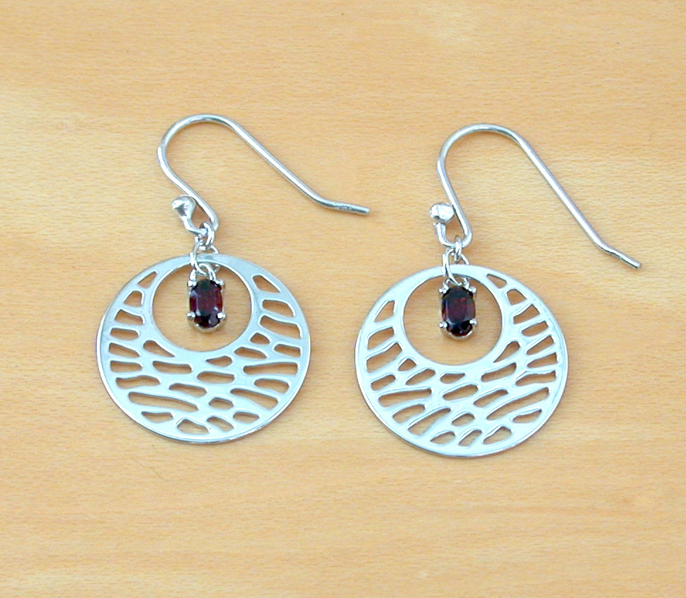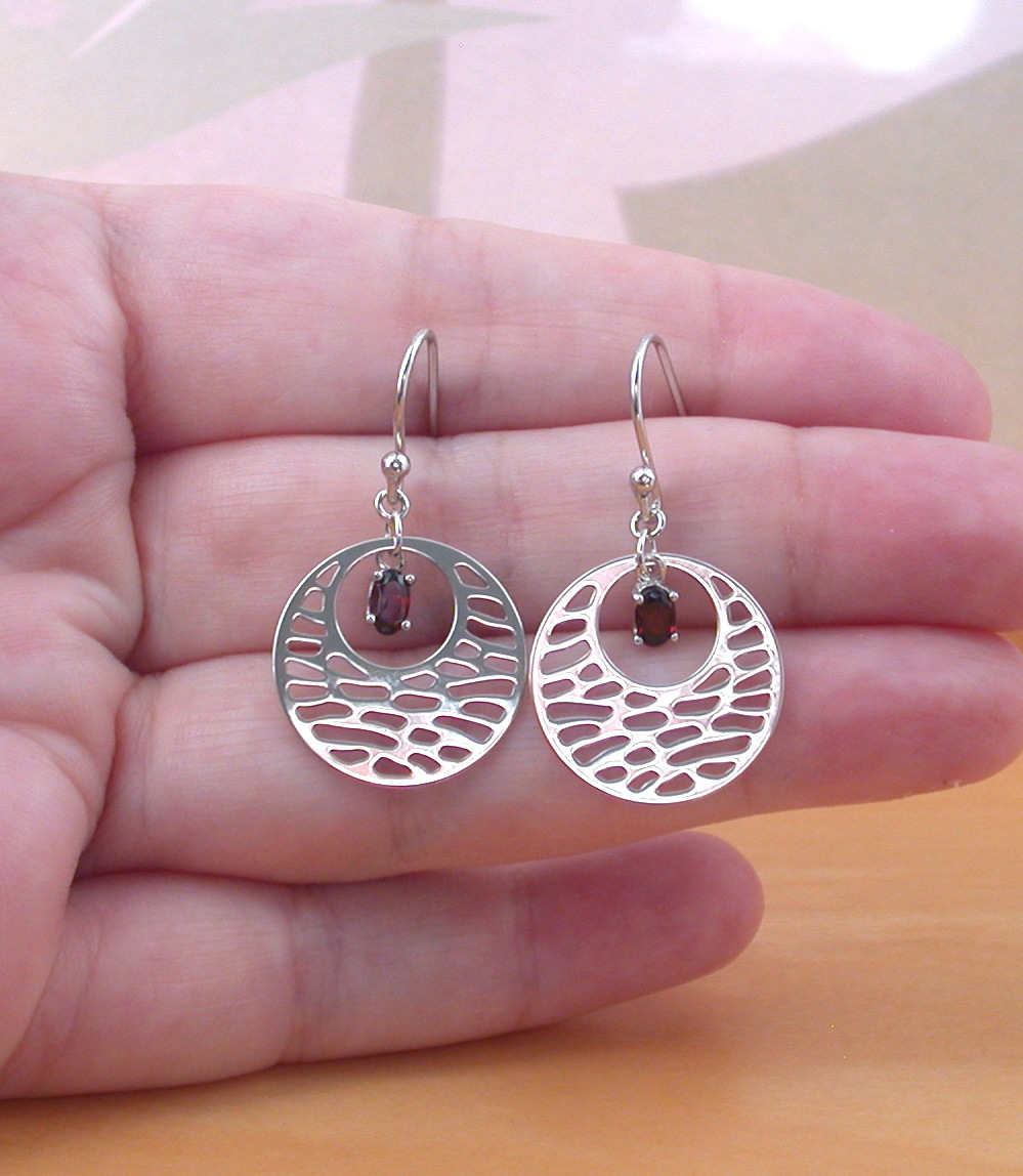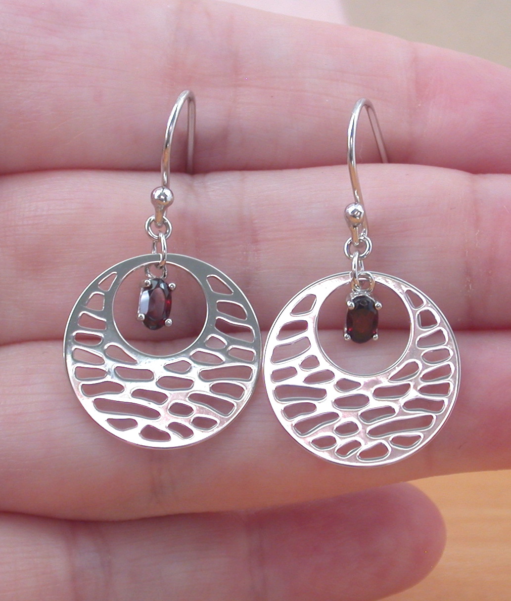 Sterling silver, circle design earrings set with genuine garnet gemstone. The earrings measure 20mm length x 20mm width. The garnet gemstone measures 5mm x 4mm. Stamped 925. Garnet is the birthstone for January.