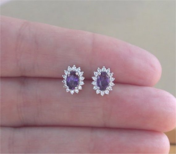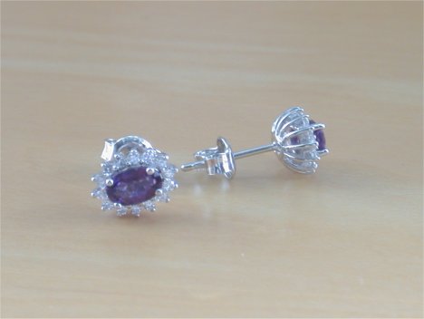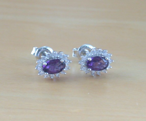 Sterling silver amethyst and Cz pendant with a sterling silver curb chain. The pendant measures 13mm height x 10mm width. The centre amethyst gemstone measures 9mm height x 6mm length. The amethyst earrings measure 9mm height x 7mm in width. The centre gemstone measures 6mm height x 4mm width. Stamped 925. Amethyst is the birthstone for February.