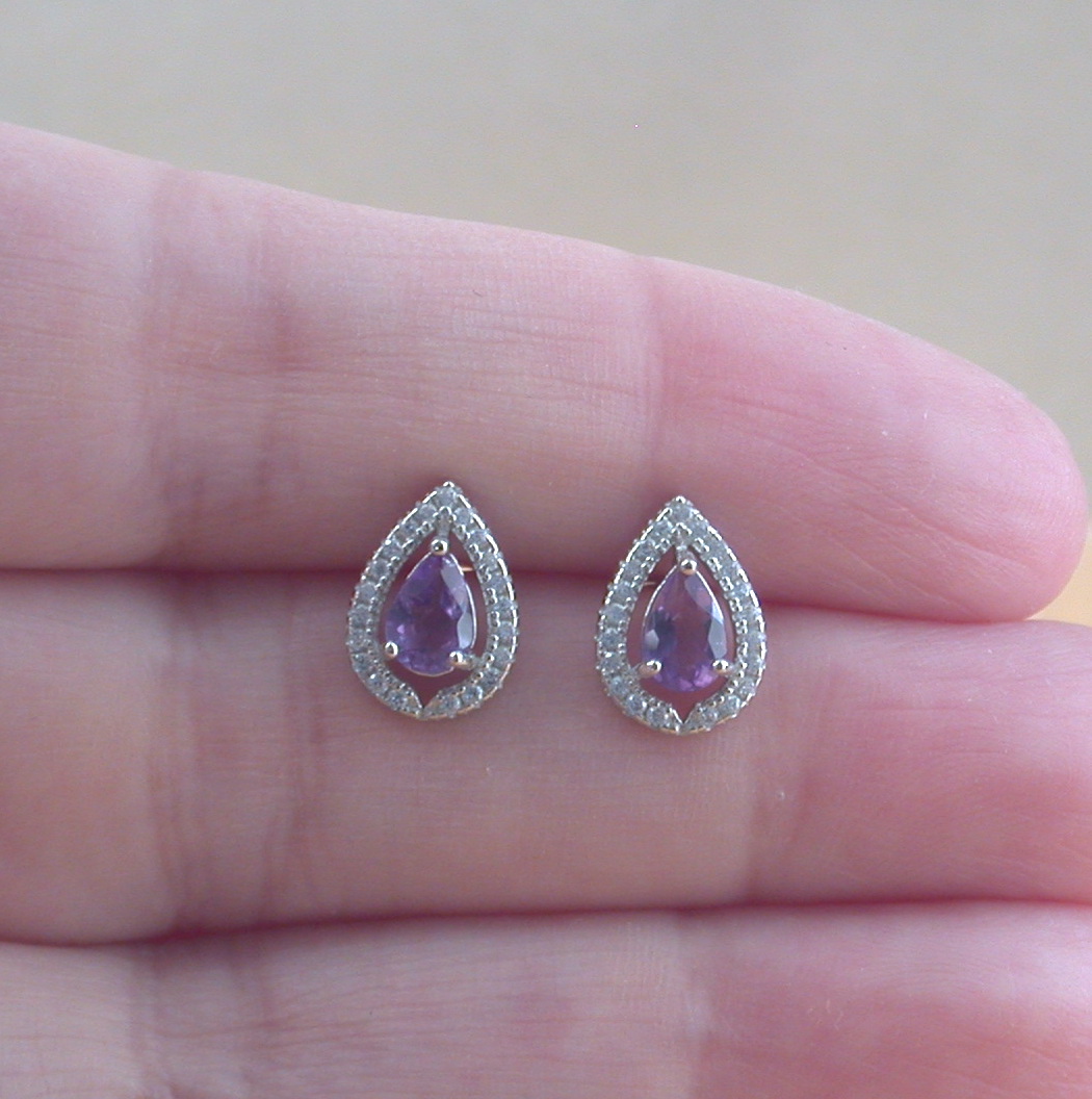 Sterling silver stud earrings with genuine amethyst and Cz gemstone. These earrings measure 11mm height x 9mm width. The amethyst gemstone in the centre measures 6mm height x 4mm width. Stamped 925. Amethyst is the birthstone for February.
