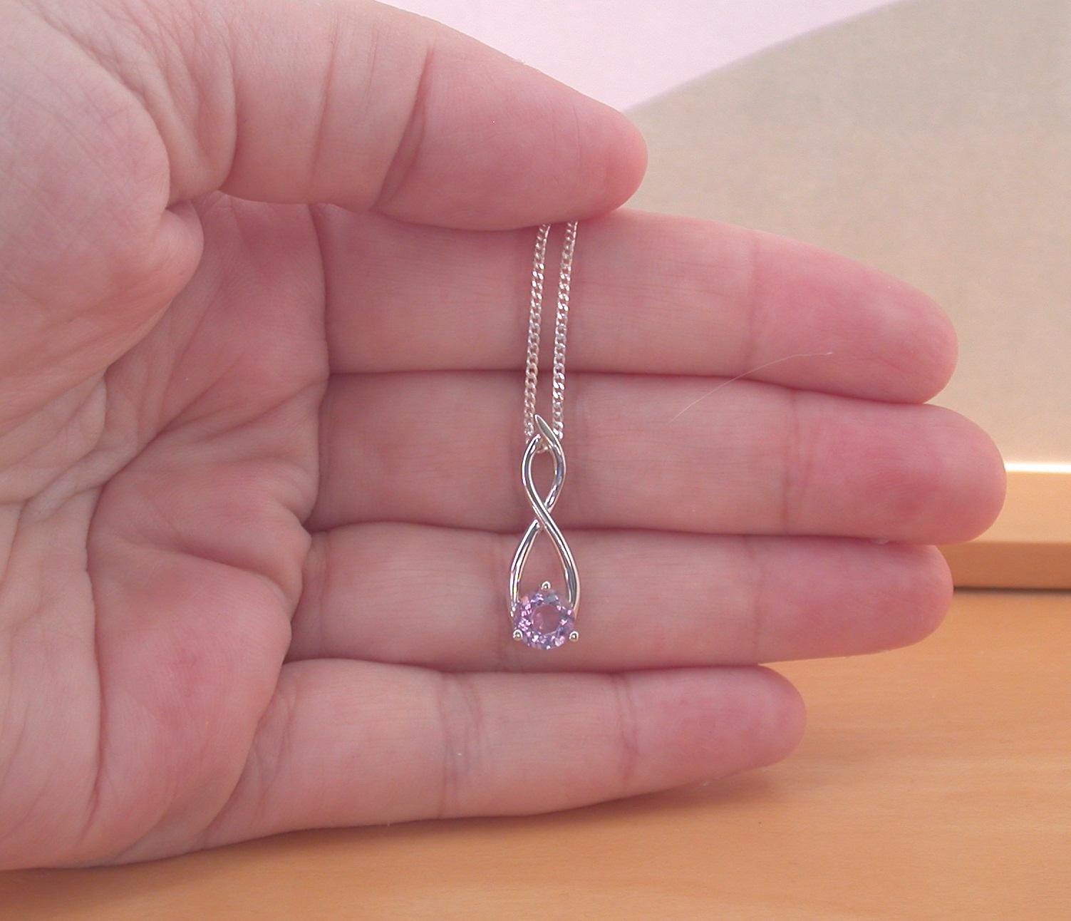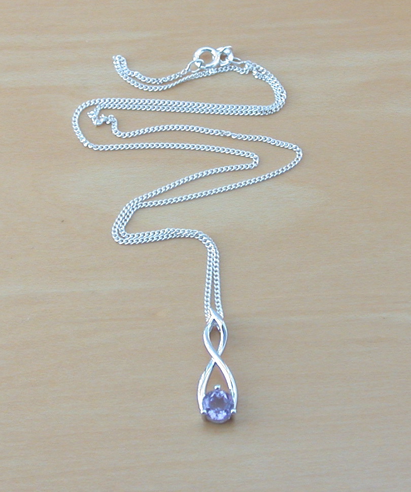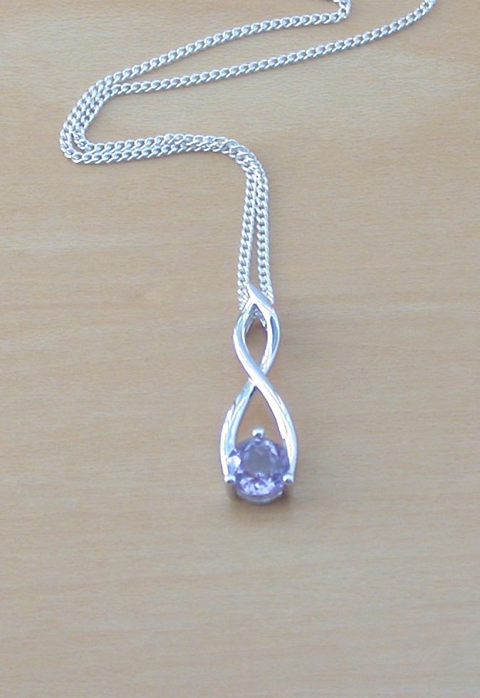 Sterling silver amethyst gemstone twist pendant. This pendant measures 23mm length x 8mm width. The amethyst gemstone measures 5mm. This pendant will come complete with 18 inch sterling silver curb chain. (16, 20 & 22 inch chains now available, please leave message through checkout) Both the pendant and chain are stamped 925. Amethyst is the birthstone for February.