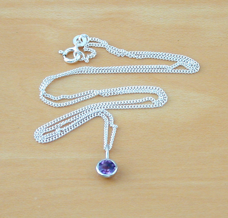 Sterling silver round pendant with genuine amethyst gemstone. This pendant measures 10mm in length x 6mm in width (including bale). The round amethyst gemstone measures 5mm. This pendant can be purchased with an 18 inch sterling silver curb chain (16, 20 and 22 inch chains available, please leave message through checkout). Stamped 925. Amethyst is the birthstone for February.