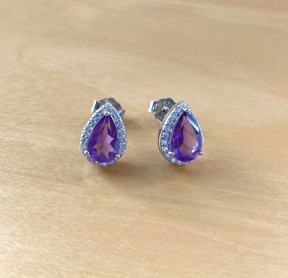 Sterling silver amethyst (natural) gemstone pendant with Cz. This pendant measures 10mm height x 9mm width. This pendant will come complete with an 18 inch sterling silver curb chain (16, 20 and 22 inch chains now available, please leave message through checkout). The sterling silver amethyst & Cz earrings measure 10mm height x 7mm width. Stamped 925. Amethyst is the birthstone for February.